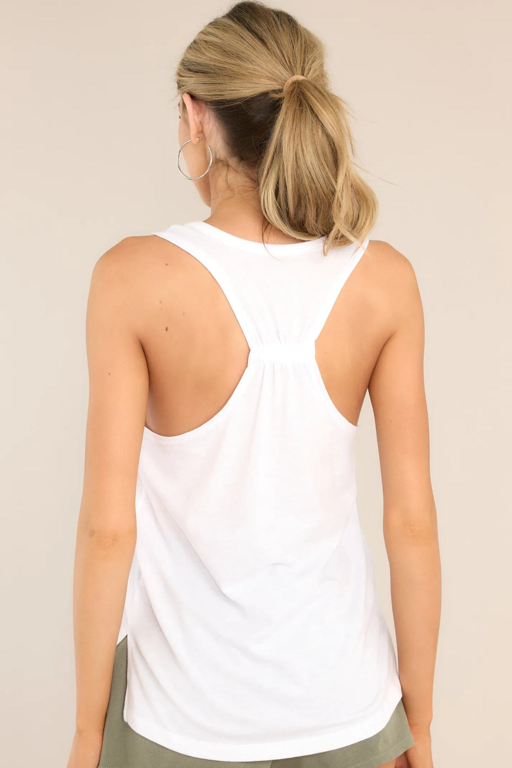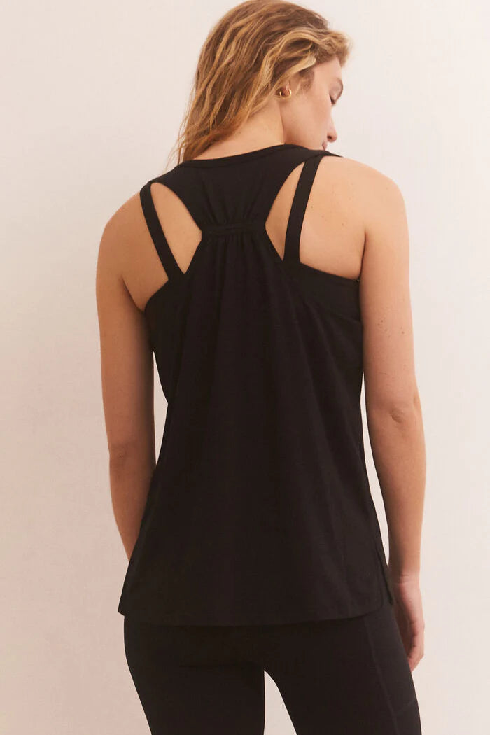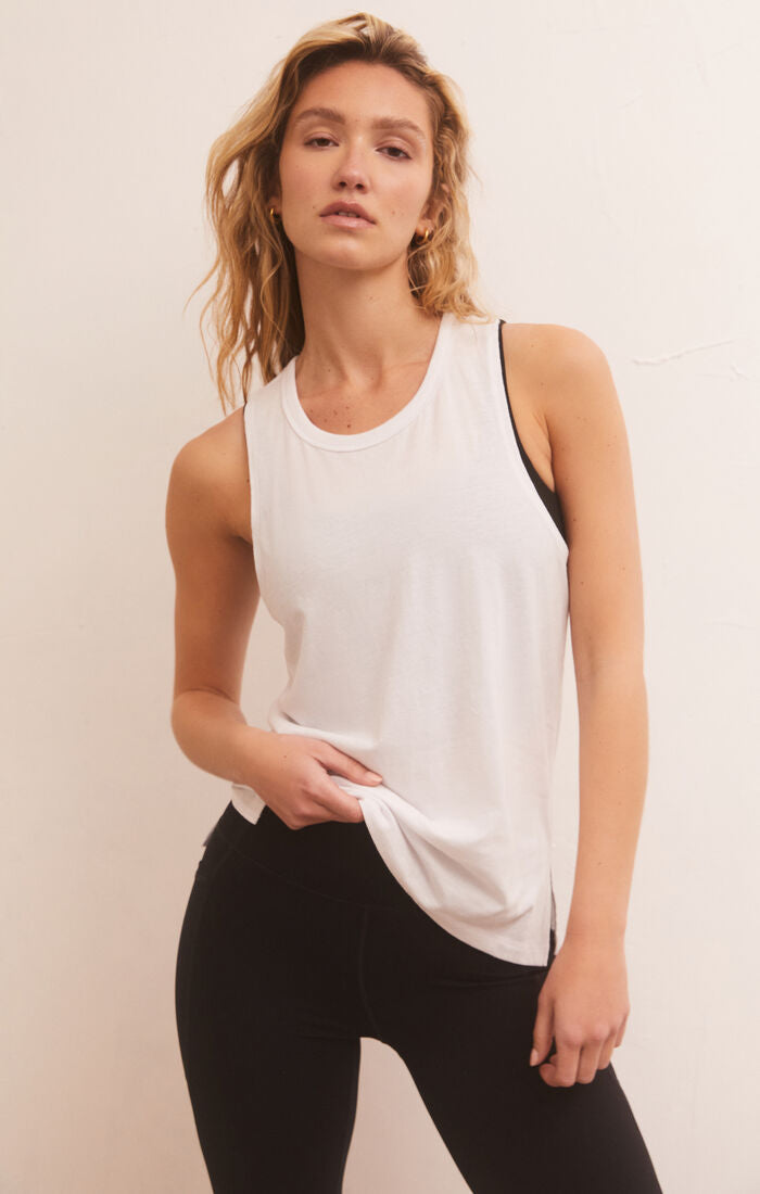 This tank features a high neck, a racerback design with an elastic band, wide arm holes and a soft stretchy material.